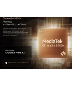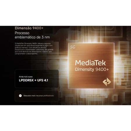 MediaTek Dimensity 9400+Processo de fabricação de 3 nmCPU:1 x Cortex-X925, até 3,73 GHz3 x Cortex-X4, até 3,3 GHz4 x Cortex-A720, até 2,4 GHzGPU:Immortalis-G925 MC12IA:NPU 890