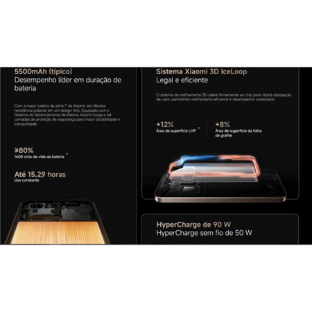 Bateria Xiaomi Surge de 5500mAh (típica)HyperCharge de 90 W*HyperCharge sem fio de 50 W*Suporta PD3.0 / PD2.0Porta de carregamento USB-C*